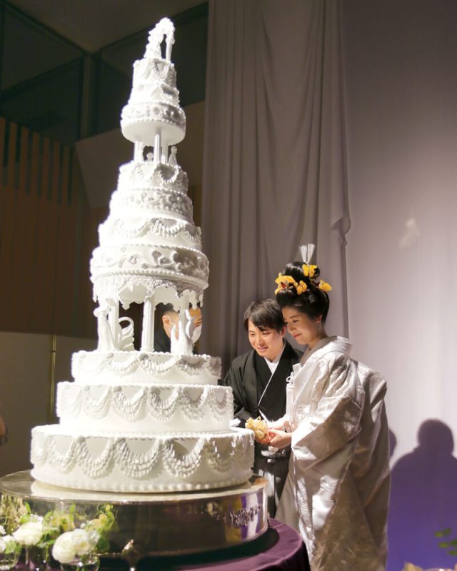 和装姿でのケーキカット。ゴージャスなウエディングケーキはゲストの注目を集めた