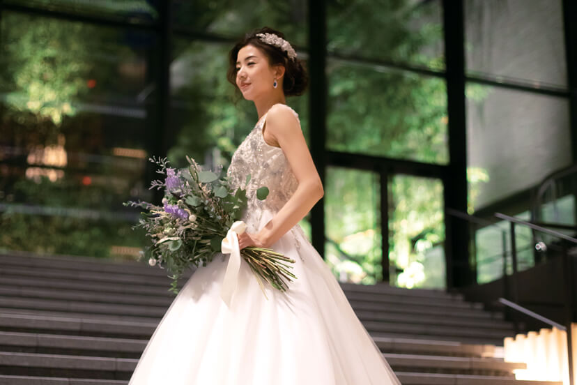 胸元のビジューが選んだ決め手の白ドレス。このホテルならではの大階段での幻想的な一枚
