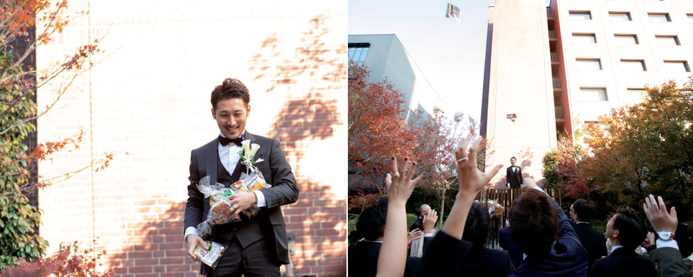 京都駅前という好アクセスな立地、洗練された空間美やモダンでお洒落な雰囲気が気に入った『ザ・サウザンド キョウト』。挙式は木の温もりに包まれ、陽光差し込む「KOMOREBIDO」で。ベールダウンをせず入場したことで、ゲストの顔が良く見え、より幸せを感じたそう。アフターセレモニーは、12月の結婚式にあわせサンタからのプレゼントをイメージした「駄菓子撒き」。新郎が投げる駄菓子を我先につかもうと大いに盛り上がった。随所にふたりらしいこだわりを盛り込んだ披露宴は、建物の美しさに感動して創ったというオープニングムービーからスタート。宴中で、特にこだわったのが料理。何度も試食を重ね、味付けにも、見た目にも一切の妥協をしなかった結果「とても美味しかった!」とゲストも大満足だったそう。友人たちから心温まるメッセージ映像や弾き語りの披露もあり、式後には「結婚式をやって良かった」と新郎がうれし泣きをする一幕も。「日頃からお世話になっている方たちにお披露目することができてよかった」と幸せそうに語ってくれた。