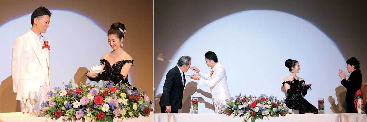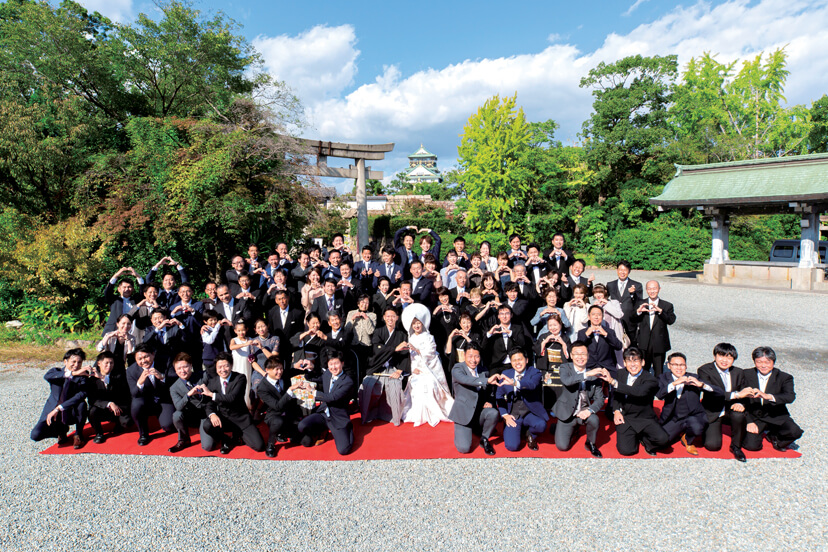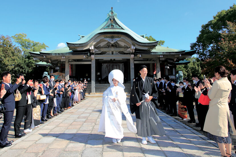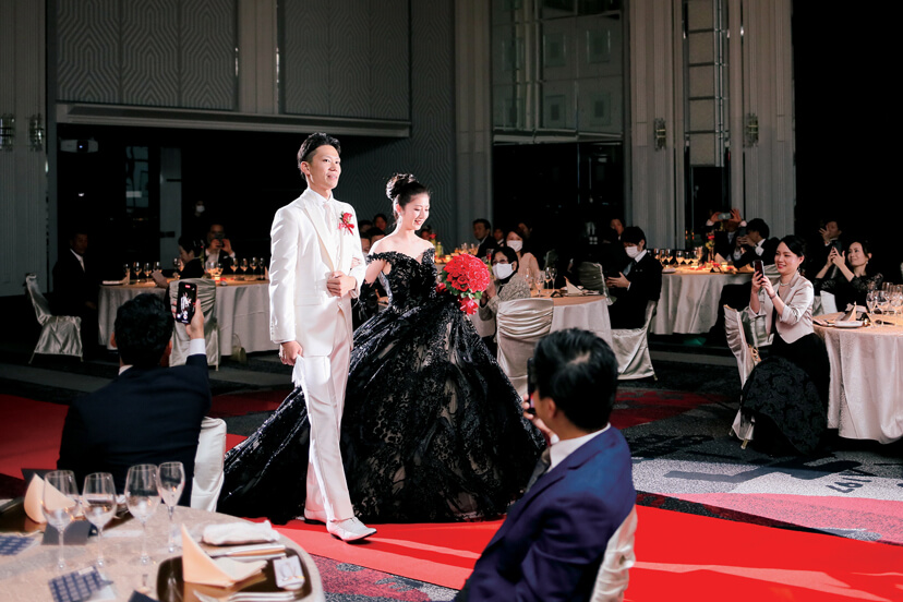和装での神社挙式、料理やサービスの安心感、そしてなにより担当者の人柄の良さが決め手となった「ホテルニューオータニ大阪」。挙式は隣接する大阪城公園内の「豊國神社」にて。多くのゲストが挙式から参列し、参進は長い花嫁行列となった。自身の髪で日本髪を結い、鶴の文様が描かれた白無垢をまとった花嫁姿は大好評。青空の下、たくさんのカメラが新婦に向けられた。披露宴の入場は真っ白のタキシードと黒のドレス。挙式と色を真逆にしたスタイリッシュな印象のふたりが、真っ赤なバージンロードを進む演出にゲストも大盛り上がり。ケーキ入刀からホテルスタッフへのサンクスバイト、新郎母や新婦祖母との中座など、サプライズ演出に会場中が笑顔で溢れた。続くお色直しではウエディングドレスに着替え、ベールを着けて再入場。スポットライトの光の中、キラキラ輝く新婦の姿に「妖精が歩いてきたかと思った」と新郎。ゲストに見守られ、指輪交換や誓いのキス。改めて夫婦となる喜びと実感が沸く瞬間となった。