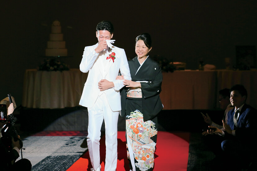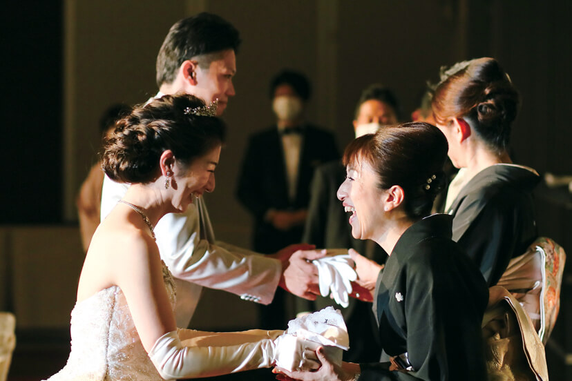 母への記念品贈呈のシーン。涙がこぼれる新婦、両家母。会場が感動に包まれた