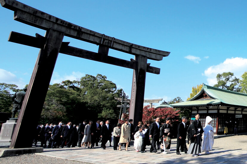 鳥居から本殿までの参道を進む花嫁行列。多くの列席者が参道を埋め尽くした