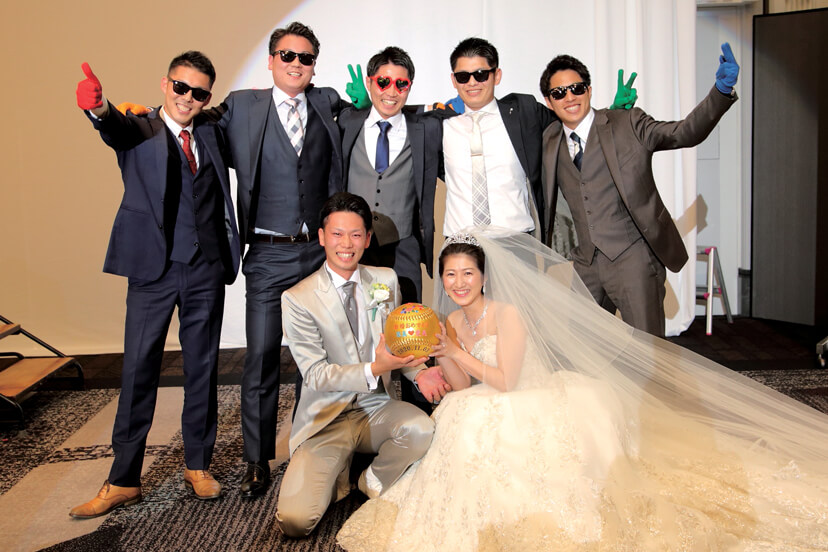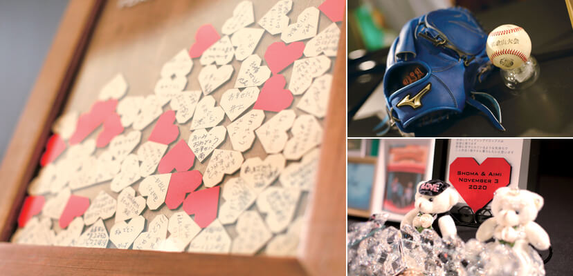 ゲストからのメッセージを集めた「ウエディングドロップス」や、高校野球強豪校出身の新郎らしくグローブと記念のボールを飾った。プロ野球選手や高校の監督からも電報が届き、思いがけない祝福に驚いたという