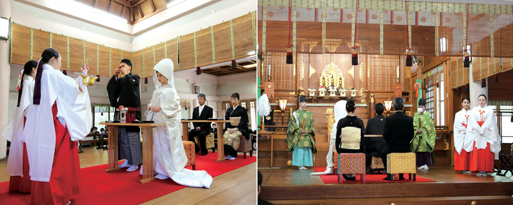 広々とした本殿では友人も着席が可能。皆に見守られ厳かに夫婦となる儀式を執り行った