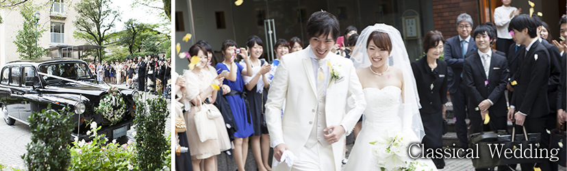 伝統と格式が薫るクラシカルな雰囲気が漂う「ウェスティン都ホテル京都」を舞台に選んだふたり。挙式は、森のなかに佇む独立型のチャペルで。クラシックカーからの登場にゲストから祝福の拍手とシャッター音が鳴り響いた。セレモニーは、清らかな歌声と生演奏が響き渡り、感動的な雰囲気に包まれた。挙式後は、青空のもとフラワーシャワーを。ゲストもふたりも晴れやかな気持ちになった。