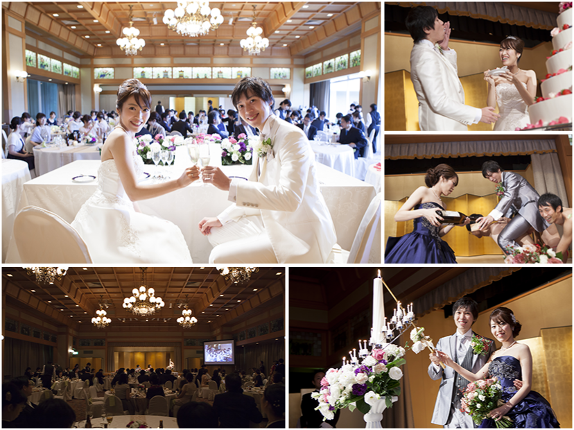 披露宴は、ふたりが一目惚れした「葵殿」で。乾杯と同時にカーテンが開き、目の前に息を呑むような素晴らしい庭園が広がりゲストへの最高のおもてなしに。何度も作り直した渾身のメイキングムービーや、たくさんの写真と動画で製作した映像演出は、ゲストからも大好評! 続く大学の先輩や友人、後輩による余興で会場の盛り上がりも最高潮に。美味しい料理もパーティを彩り、思い通りの一日が叶った。