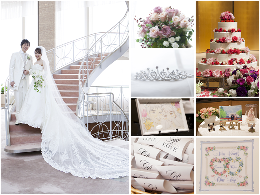 トレーンが素敵なウエディングドレスに母と一緒に選んだティアラでエレガントな花嫁に。両家のお母様が何ヵ月もかけて作ってくれた刺しゅうのウエルカムボードや、友人が描いてくれたふたりの似顔絵、叔母手作りのブーケなど結婚式を祝福してくれる気持ちが伝わるアイテムの数々。新婦こだわりの5段のウエディングケーキは理想通りで大満足。すべての想いがカタチになった最高の一日となった。