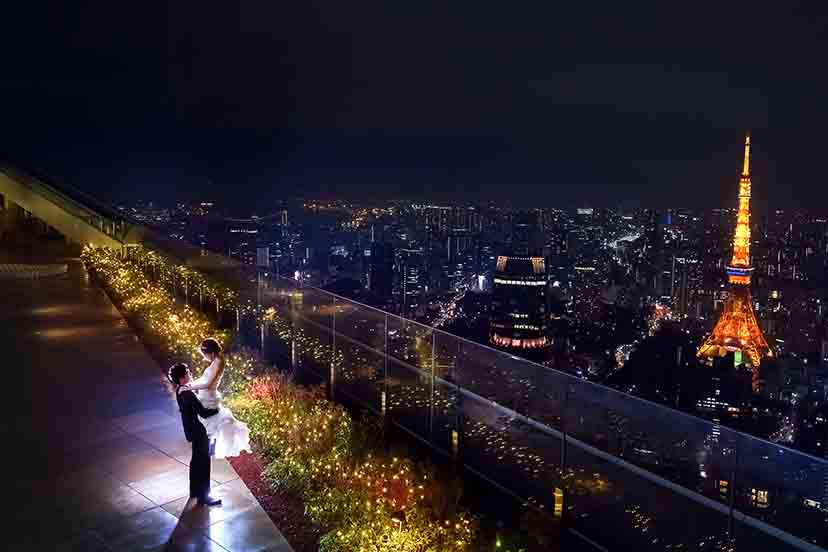チャペルに隣接する最上階の開放的なテラスからは、ここでしか味わえない東京の美しい景色が見渡せる。時間帯や季節によって表情を変える自然の風景は、ドラマティックな最高の演出。広々としたテラススペースでは、ウエルカムドリンクやデザートブッフェ、カクテルタイムを行うなど幅広いアレンジが可能。