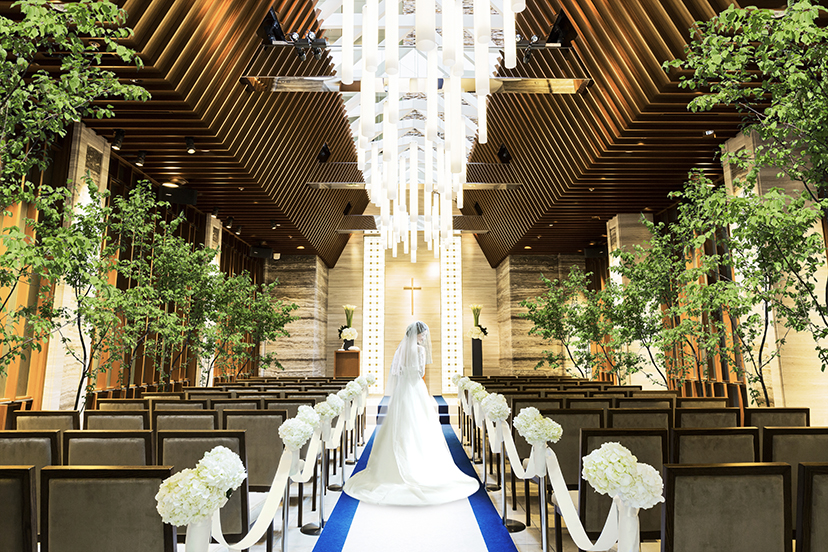 空中に巨大な十字架が浮かぶ神秘的なチャペルは、スタイリッシュなデザインながら、杉の木の香りが漂う温もり溢れる空間。無数の木片を組み合せた、空へと伸びるような直線のラインが特徴で、新婦だけでなく新郎からも絶大な支持を受けている。過度な装飾のないすっきりとしたデザインが、ドレス姿の花嫁をひときわ美しく輝かせてくれる。16mの天窓から光が降り注ぐ荘厳な雰囲気の中、ふたりとゲストが一体となるような挙式が叶う。