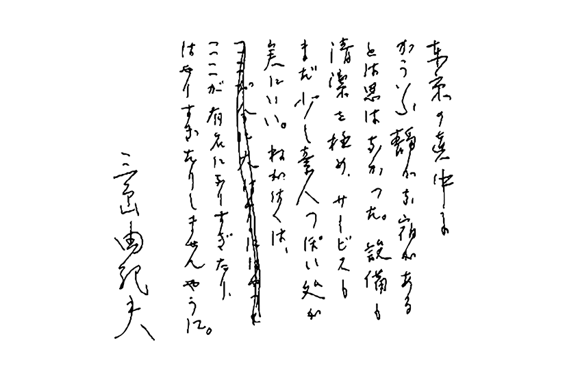 三島由紀夫氏が、社長の吉田氏に手渡した原稿。『東京の眞中にかういう静かな夜があるとは思わなかった。設備も清潔を極め、サービスもまだ素人っぽい処が実にいい。ねがわくは、ここが有名になりすぎたり、はやりすぎたりしませんやうに。三島由紀夫』と書かれている。