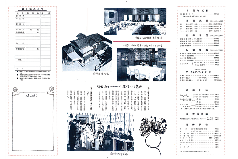昭和30年当時の婚礼パンフレット。当時の挙式の主流である神前式の紹介や料金等の歴史を垣間見ることが出来る。