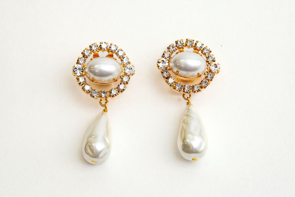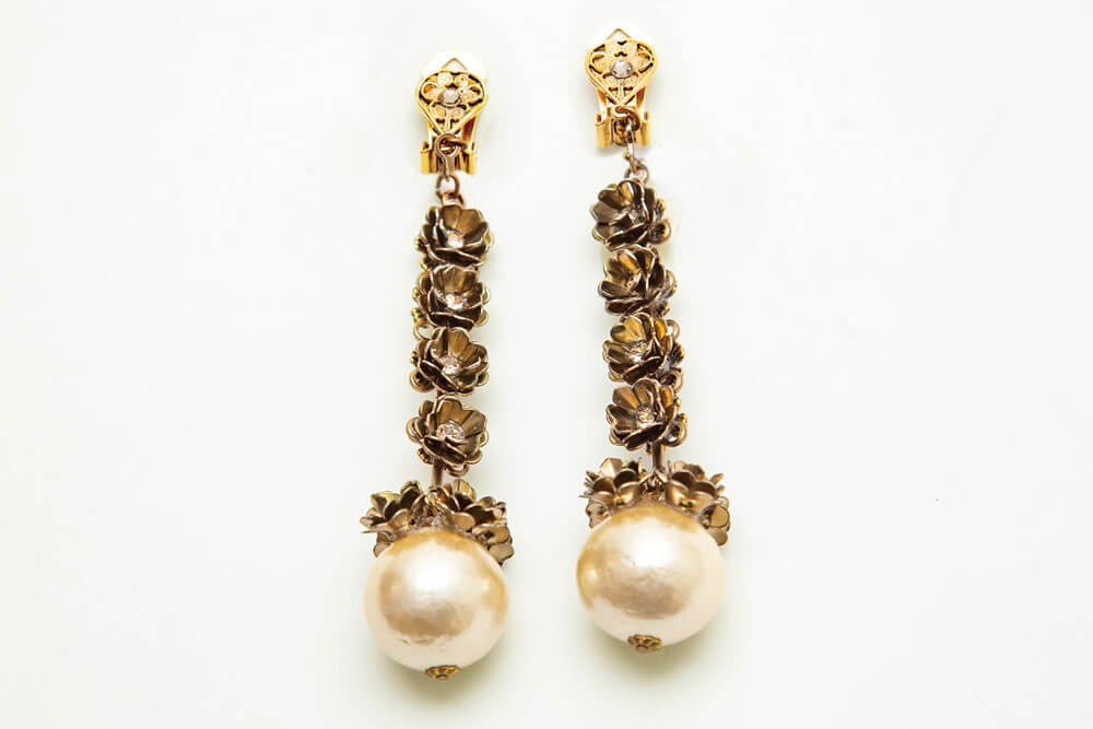 アンティーク調のゴールドとパールのコントラスがポイント。シンプルなドレスに存在感をプラスして。