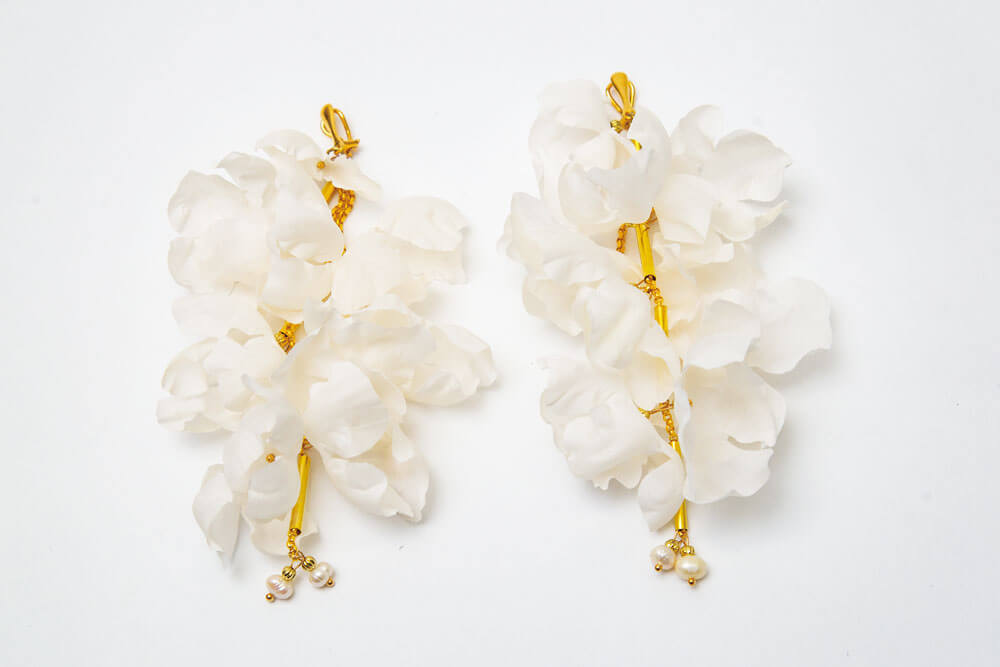 ボリュームあるシルクフラワーが花嫁の耳元を美しく見せる。小さな淡水パールがアクセントに。大人のフェミニンさを演出する優美なイヤリング。