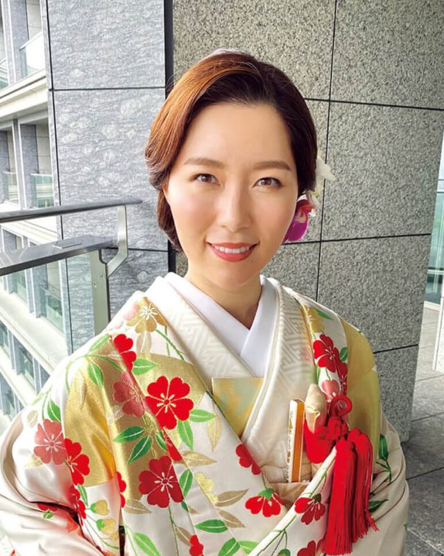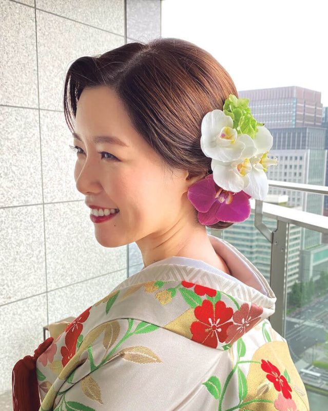 落ち着きのある大人のモダンスタイルで上品な和の花嫁に。艶やかな胡蝶蘭の髪飾りも艶髪と和装に美しく映える。