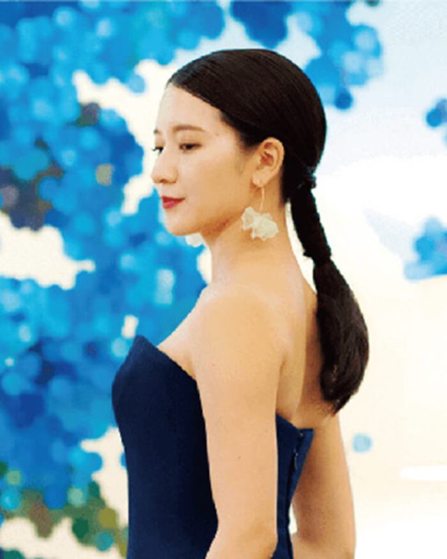 一束にヘアを巻き付けたシンプルかつハイセンスなヘア。可憐な顔立ちも眉の印象を変えればシャープに早変わり。