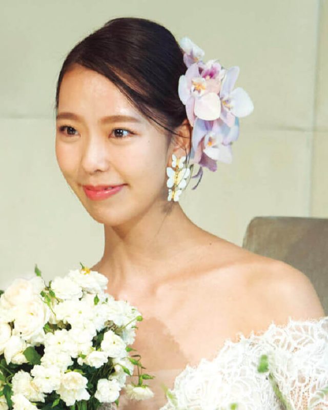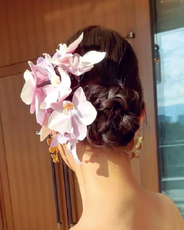 大ぶりな花飾りもすっきりとしたシニヨンでまとめることで華やかさもありながら清楚な印象に。
