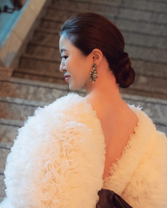 ゆったりとしたセンターパートに、ツイストでまとめたローシニヨン。メイクにもメリハリをつけ気品を漂わせて。