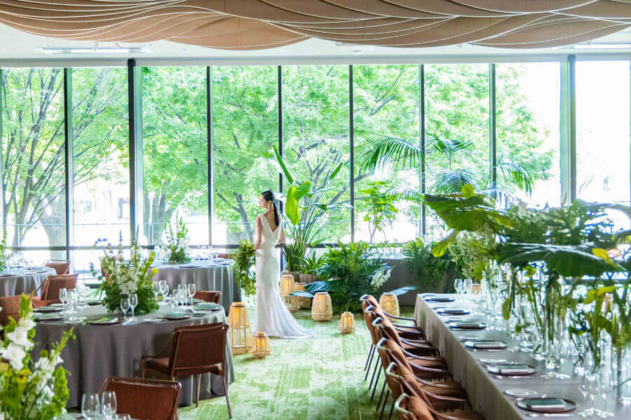 デザイン違いの3つの披露宴会場。窓一面からは久屋大道公園の緑を望むパノラマビュー。森の中で過ごすことができるような会場や、自然素材をモダンにアレンジした上質な会場、デザイン性が高くホテルライクな会場。ふたりのイメージにあわせて選ぶことができる。