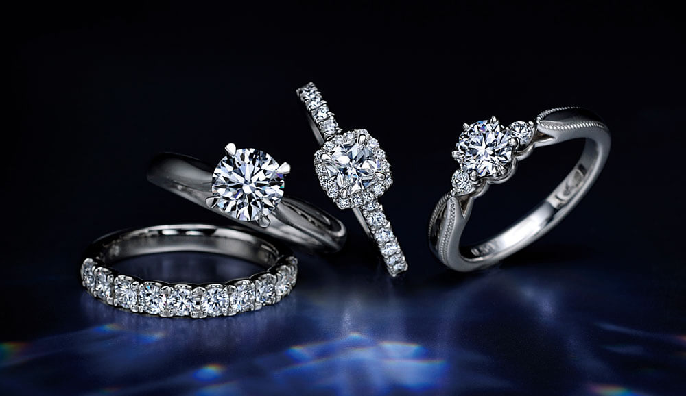 シンプルからバゲットカットとラウンドカットを交互に配置したデザインまで幅広いシリーズ。刻々と表情を変える水面の煌めきを、カットの手法で表現。