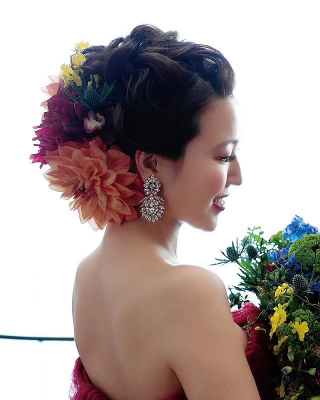 鮮やかな赤のドレス姿を彩るのは、ヘッドにたっぷりあしらったカラフルな生花。花材も形もさまざまに大小変化を付けて置くことで、軽やかに見えるよう調整。