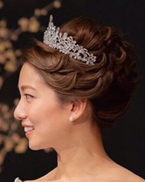 フォーマルな夜会巻きをベースに、艶を出したウエーブをのせて軽やかに。ボリューミーなティアラに合わせ、ヘアのトップに高さを出し、ロイヤルウエディングのような気品をまとって。