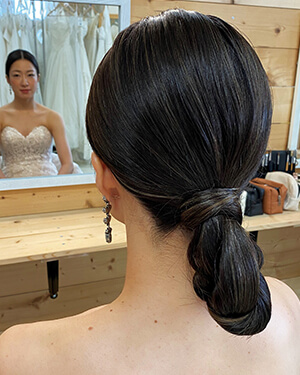 ギブソンタック風のシンプルなシニヨンに、エレガンスを漂わせて。おくれ毛を出さずすっきりとまとめることで清潔感を与える。