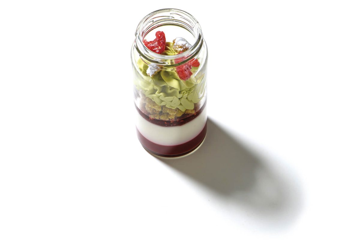 ピスタチオのコクのあるクリームと滑らかなバニラパンナコッタ、甘酸っぱいラズベリージャム、クランブルの重なった層が美しい。スプーンで底からすくって味わうのがおすすめ。