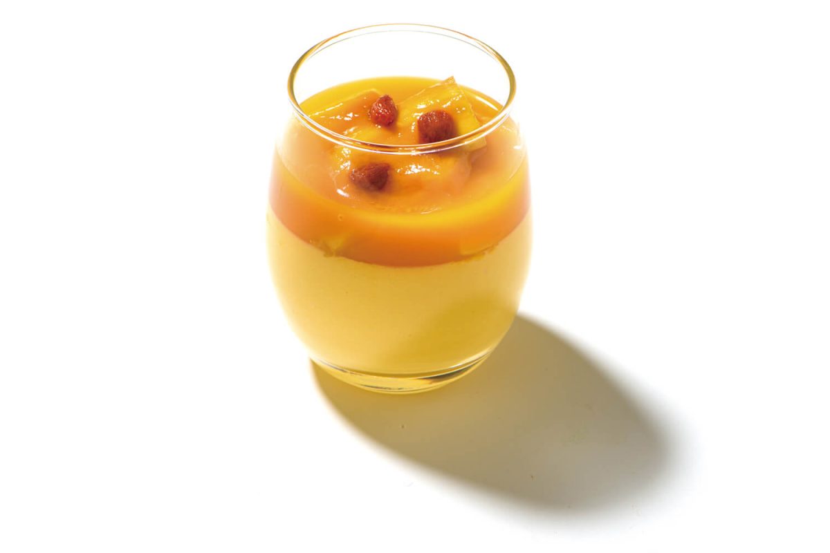ホテルの代名詞的存在であるマンゴープリン。風味や香りがしっかりしたアルフォンソマンゴーをプリンに使用し、果肉をトッピング。スプーンを入れるとココナッツソースが現れる。