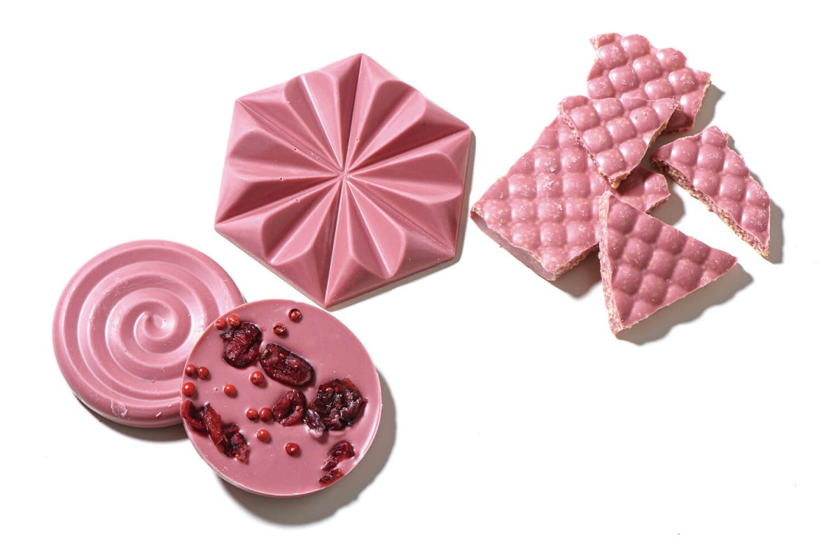 パールパウダーを混ぜ合わせた、果実味のあるルビーチョコレートにコーンパフを合わせたり、ピンクペッパーをトッピングしたりと斬新な組み合わせが美味しさを引き出す。