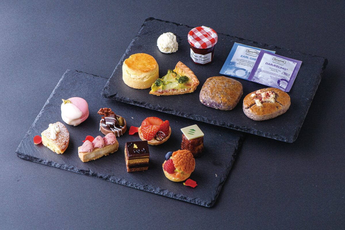 イチゴのマカロンやベリーのシュークリーム、スコーン、キッシュなど12種のアフタヌーンティーを。ホテル名物のスコーンは3種類用意。ベリー尽くしのスイーツで春を満喫して。※お渡し希望日の2日前19時までに要予約