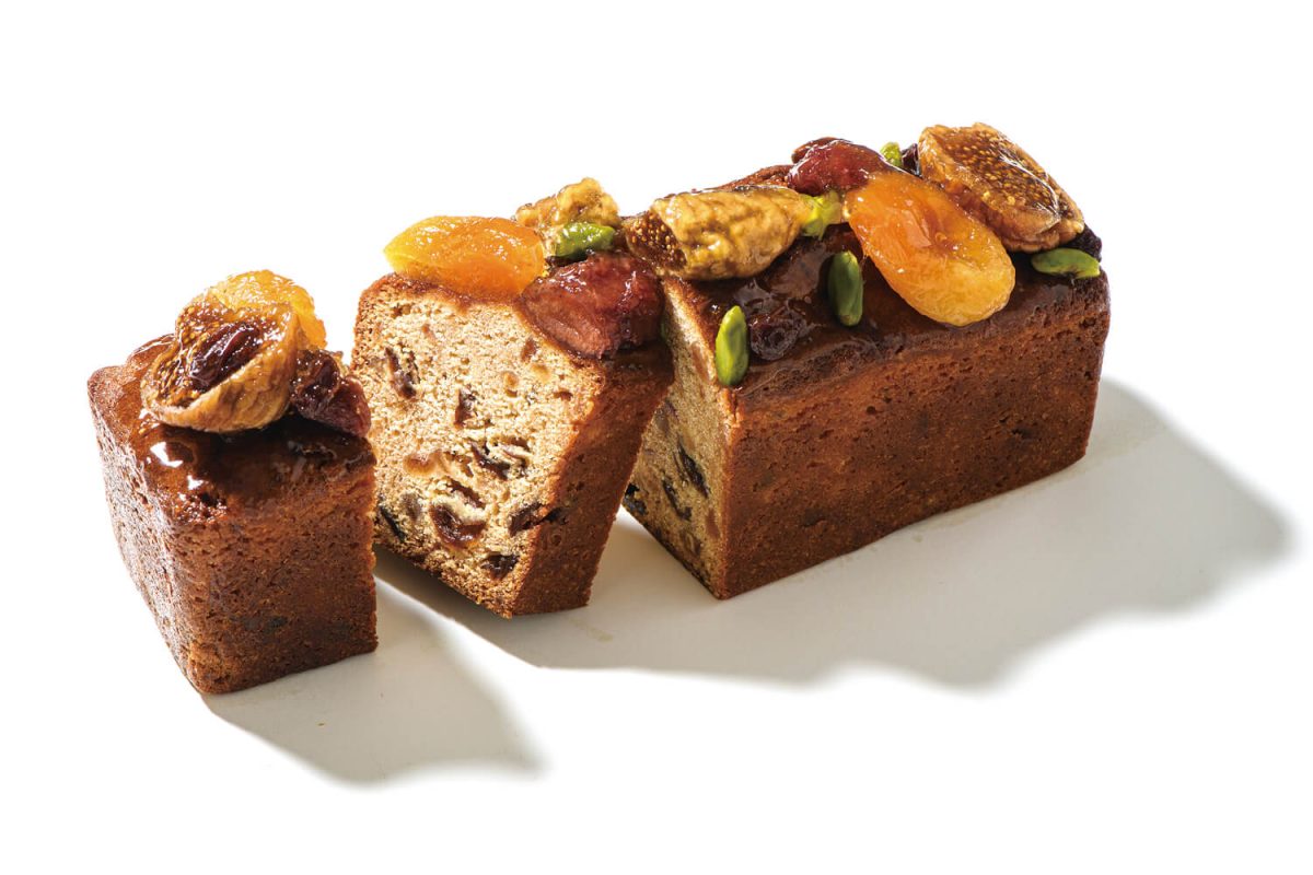 スキムミルクやヨーグルトなどを入れしっとりした生地に、30日間ラム酒に漬け込んだドライイチゴ、イチジク、アプリコットなどのフルーツをトッピングした大人の味わい。