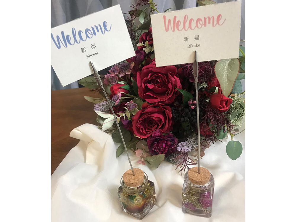 瓶の中はハーバリウム。人気のアイテムでインパクトのあるボトル席札を作成中です。ゲストが持ち帰って飾りたくなるような素敵な席札を目指していてまだまだ改良する予定!