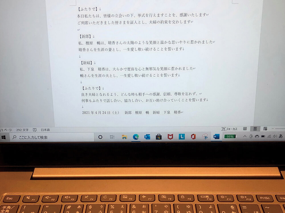 人前式の誓いの言葉を試行錯誤しながら作り新郎とふたりで練習しています。
