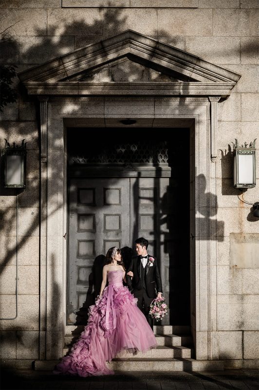 西日が強いなか、影でアクセントを追加して絵画のような一枚に。色味は全体的に少し抑え、新婦お気に入りの華やかなピンクのドレスが際立っているのが印象的。