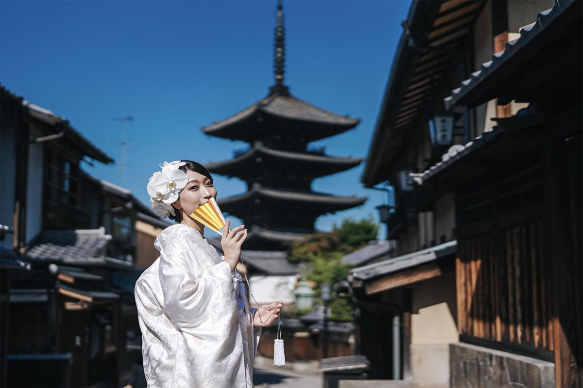 八坂エリアでも人気の五重の塔をバックに。指先の仕草までこだわり、扇子で口元を隠して奥ゆかしさを表現。白無垢・胡蝶蘭の髪飾りと五重の塔とのコントラストが秀逸。