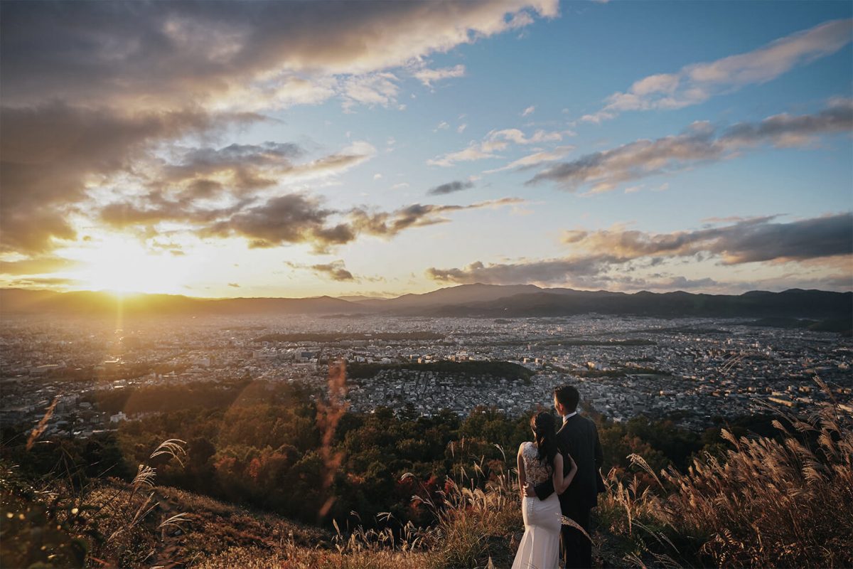 ふたりが出会った京都の街並み、連なる山々、夕日の風景にふたりを馴染ませて、一枚の絵のように収めたショット。場所や時間、夕日の具合まで入念に計算して撮影。
