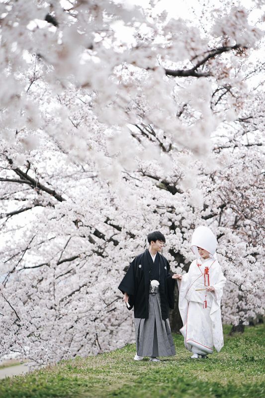 こぼれ落ちそうなほど満開の桜を画面いっぱいに写した一枚。伝統的な和の装いに身を包み、手を取り合って歩くふたりの、幸せな空気感が溢れています。