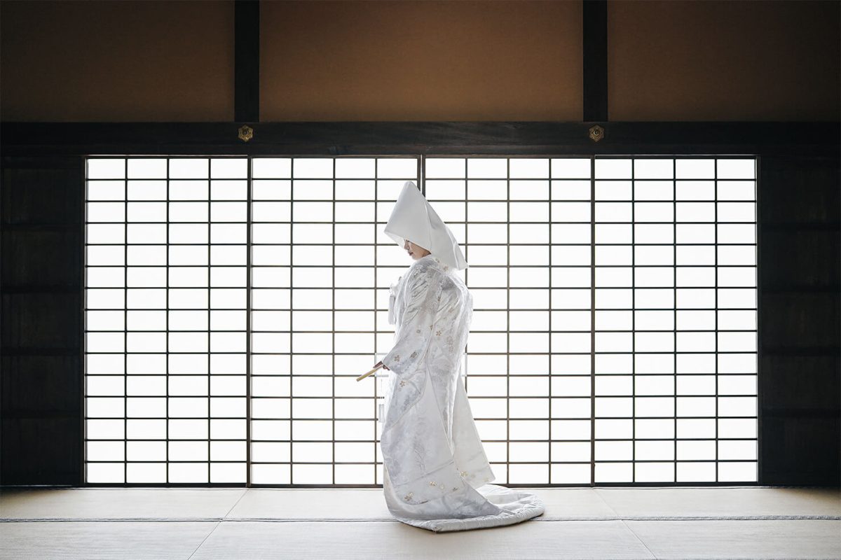 三脚を使って建物の水平垂直を見極め、シンメトリーの構図を完璧に表現。綿帽子から覗く静かな横顔に、花嫁の奥ゆかしさと凛とした強さを感じます。