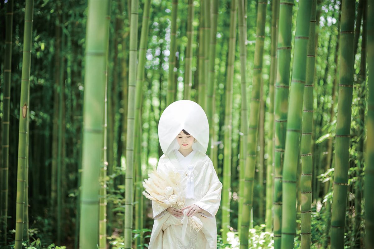 静かに微笑む花嫁の表情に焦点がいくよう、あえて余計なポージングは付けずに。真っ直ぐ伸びた緑豊かな竹と、凛と立つ白無垢姿の花嫁のコントラストが芸術的。