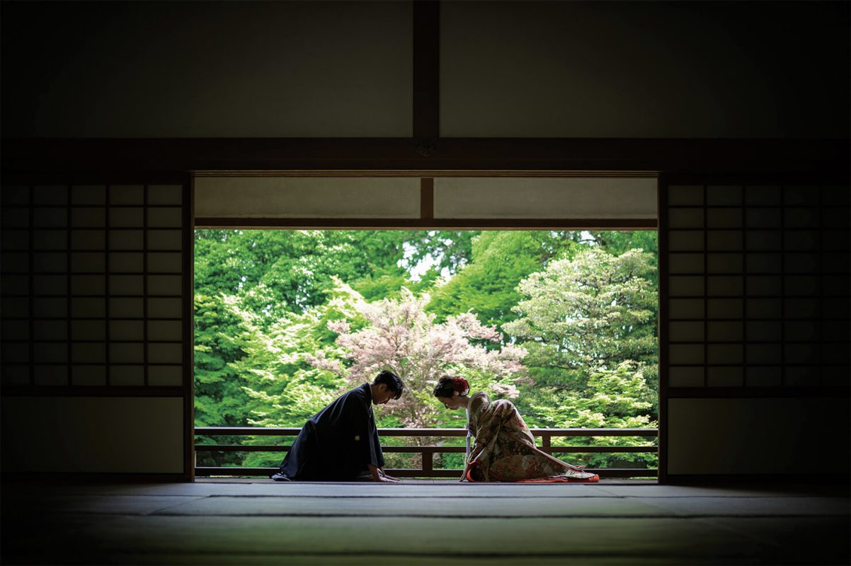 静寂に包まれた京の寺院で。厳かな空気を演出するため、庭園の圧倒的な緑と対比するように、あえてふたりをシルエットに近い姿で撮影。