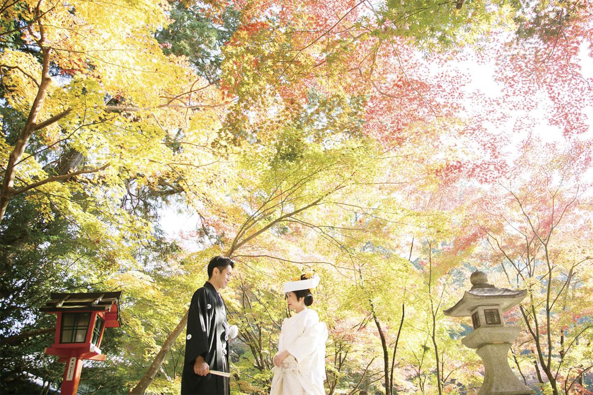 見事な紅葉のグラデーションを生かして、人物の比率が少ない構図に。和装で凛とした雰囲気を醸しながらも、少し恥ずかしそうに相対するふたりの、幸せそうな表情が印象的。