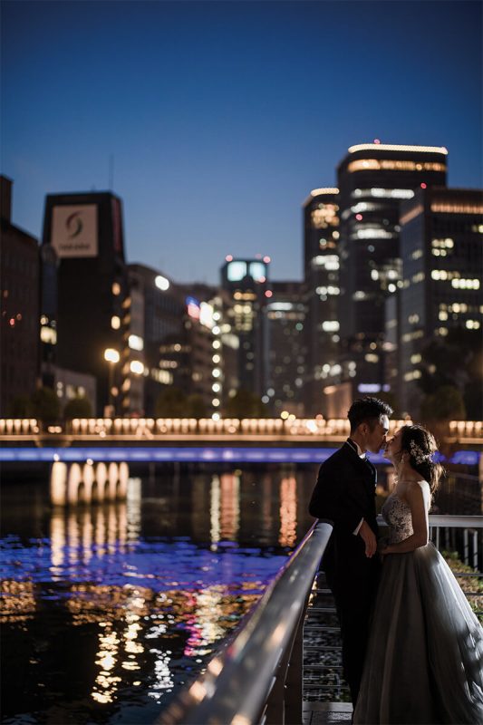 顔を寄せ合い、しっとりと大人な雰囲気のふたりが素敵。夜のオフィス街が放つ光を生かし、夜のオフィス街が放つ光を生かしを抑えて1灯のみで撮影。
