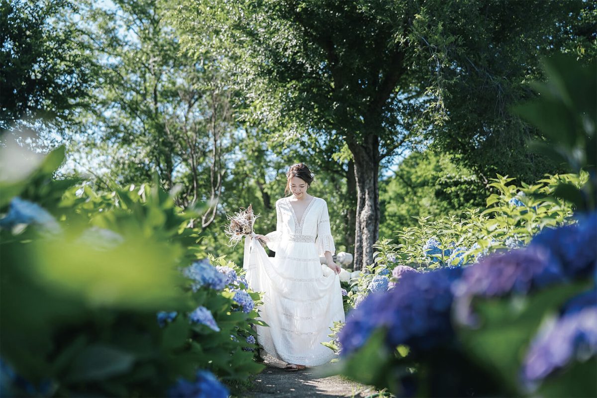 アジサイに包まれるように佇む花嫁を、ローアングルから狙った絶妙な構図で撮影。レーシーなドレスのディテールが出るように、ポージングも意識。