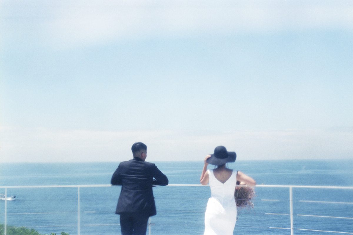 ぼんやりと滲むような色の表現が、どこか詩的な美しさを感じさせる一枚。地平線を見つめて帽子を傾ける新婦と新郎の後ろ姿に、潮風や波の音、その瞬間の空気まで伝わってきます。