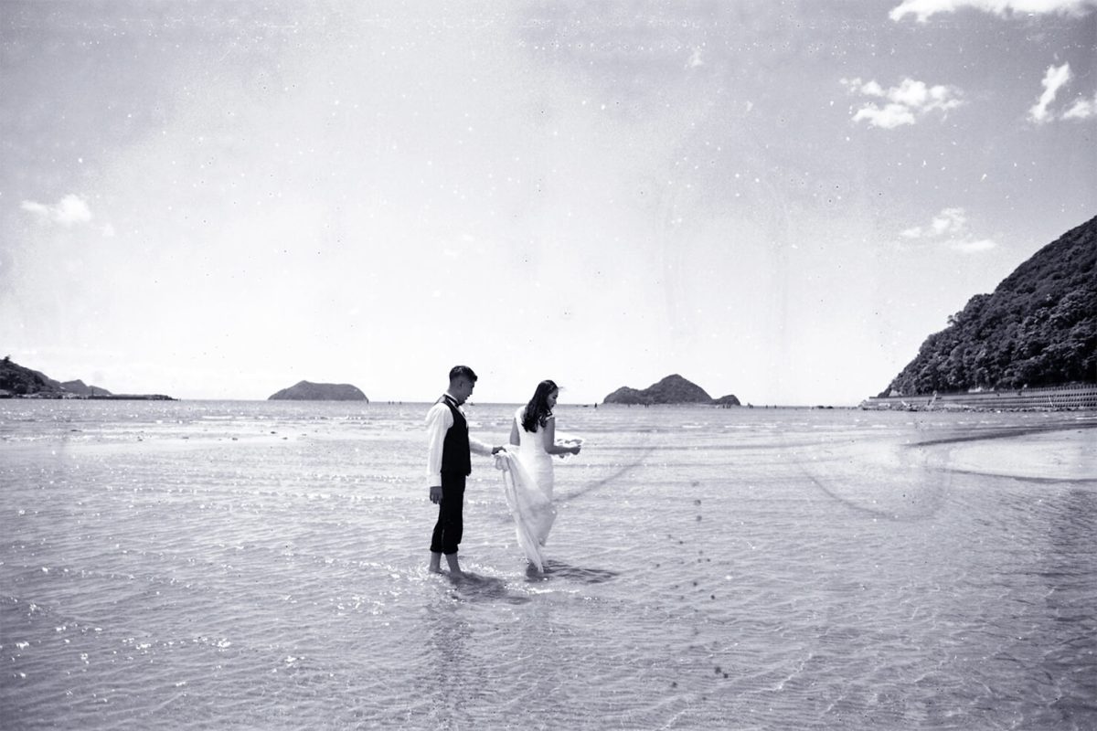 真夏のビーチのフォトシューティングは、あえて全編をモノクロで。寄り添うふたりの距離感や、その佇まいの美しさをそのままに表現。シンプルだからこそドラマティックに。