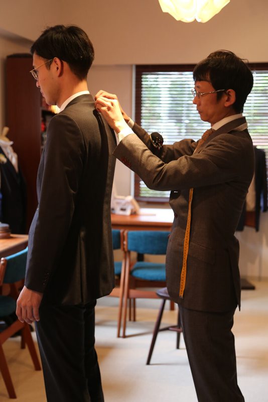 正確な採寸とともに大切な要素が、身体のクセ。肩が上がりやすい、下がりやすい、左右差がある。腕や腰、お尻まわり等、細かな部分までチェック。既製品では皺が寄りやすい背中もぴしっと平らに。平面の生地を立体である人の身体に仕立てる凄技。