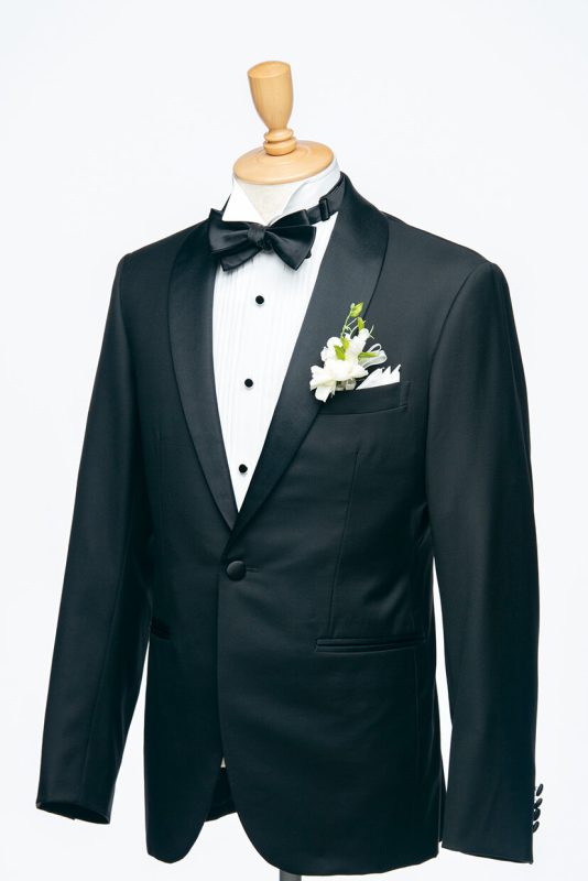 フォーマル度の高い黒のタキシードだが、全体的に細身のシルエットにまとめることで今どきのスタイルに。細やかなディテールまで計算されたタキシードで上級者におすすめの一着。