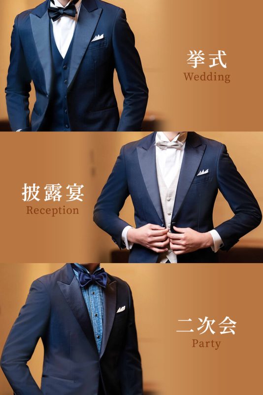 これまで「ブライダルタキシード」「ロングタキシード」などと呼ばれた光沢感のある丈の長いジャケット&アスコットタイという新郎衣裳に変化の兆し!? ショート丈の正統派タキシードをお洒落に着こなす新郎が増えてきた!トレンドの中心はブラック、ネイビー系で、花嫁のドレスを引き立てるシックなカラーだ!