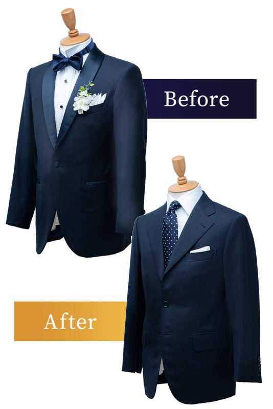 「KNOX & TAYLOR」では一般的なスーツの「ノッチドラペル」の上に「ピークドラペル」を縫い付けて仕立てているため、式後は「ピークドラペル」を取り外すことが可能(リメイク料金2万2千円~)。タキシードのフォーマル過ぎるというお悩みもこれで解消できる。