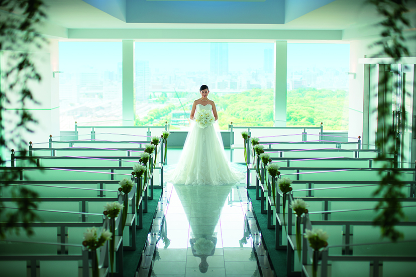 「ホテルニューオータニ大阪」には、好対照なふたつのチャペルが用意されています。ひとつは最上階に位置し、大きな窓から緑豊かな大阪城の森を望むスカイチャペル「ブリリアント・アイズ」。随所にあしらったフロストガラスから光が射し込み、白を基調とした透明感のある空間はスタイリッシュな印象。花嫁が幸せになれるというサムシングブルーを思わせる青いステンドグラスの十字架に見守られて、開放感いっぱいの挙式がかないます。